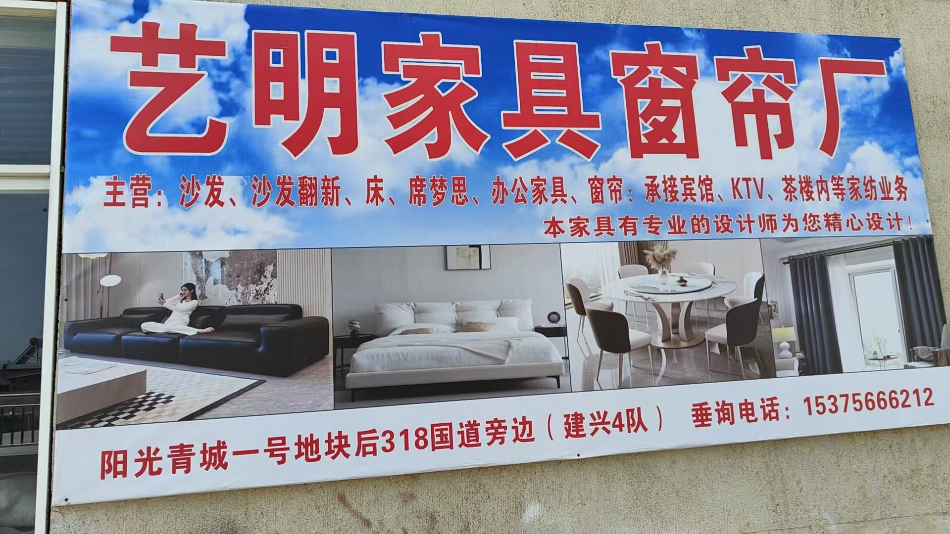 艺明家具窗帘厂主营业务: · 家具销售:沙发、床、办公家具 · 窗帘定制:提供各式窗帘测量、设计及安装 · 沙发翻新:更换面料、海绵,修复旧沙发 · 场所配套:为宾馆、KTV、茶楼等整店提供家具(沙发、床等)及窗帘的一站式配置与安装服务