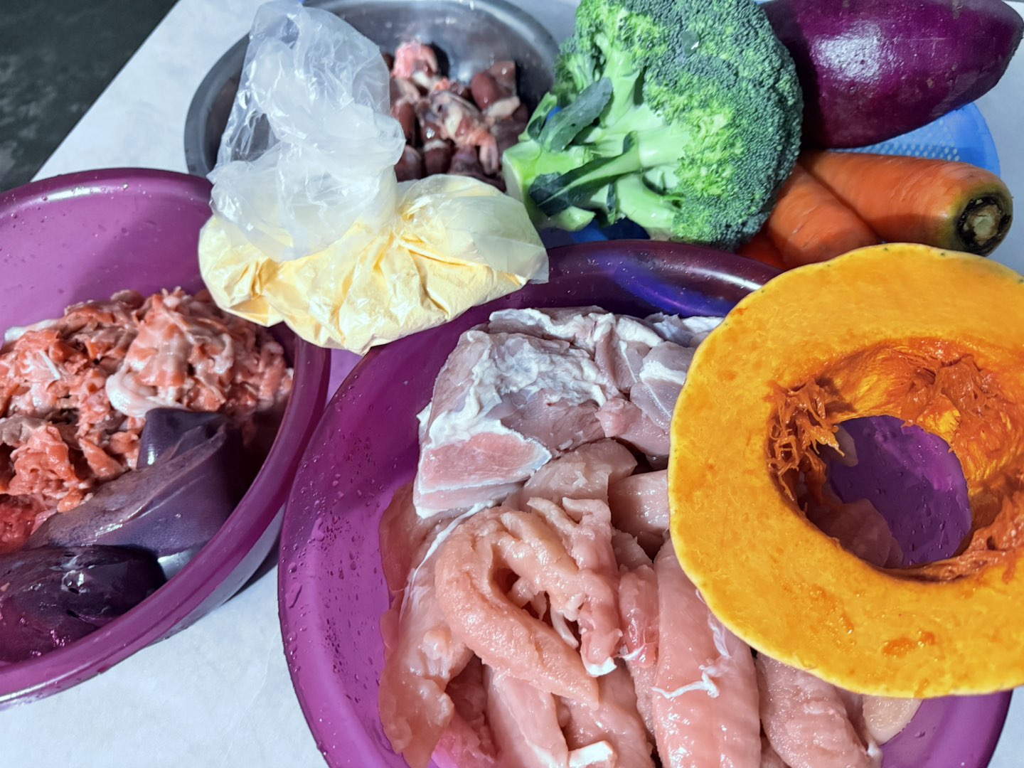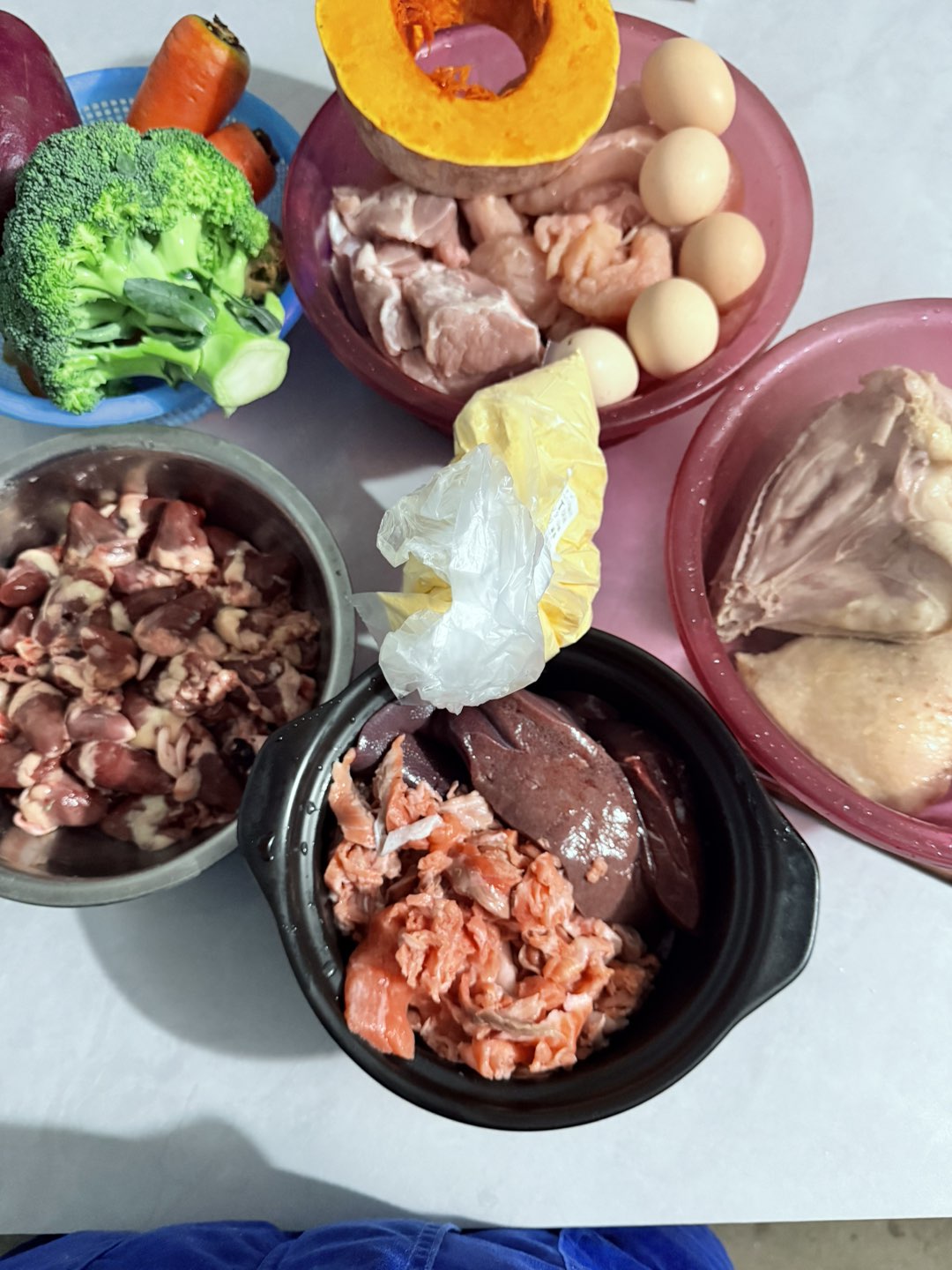 三文鱼,鸡胸肉,鸭腿肉,猪肉,猪肺,鸡心,南瓜,红薯,胡萝卜,西兰花,鸡蛋,玉米面。干净卫生。微信手机同号